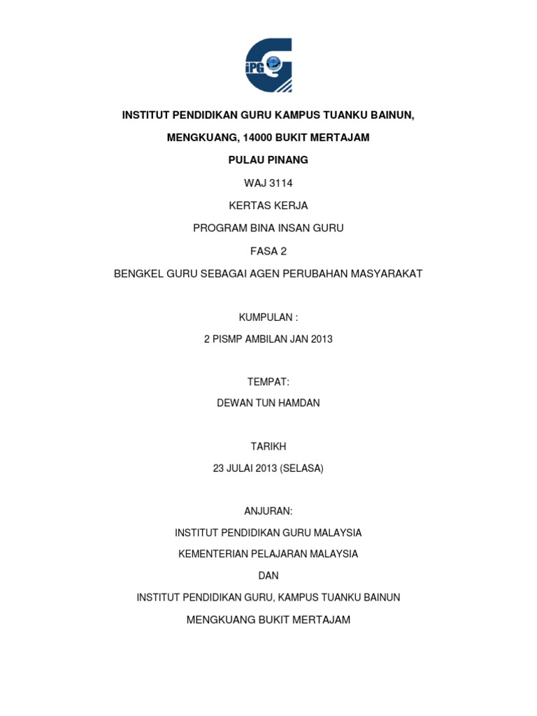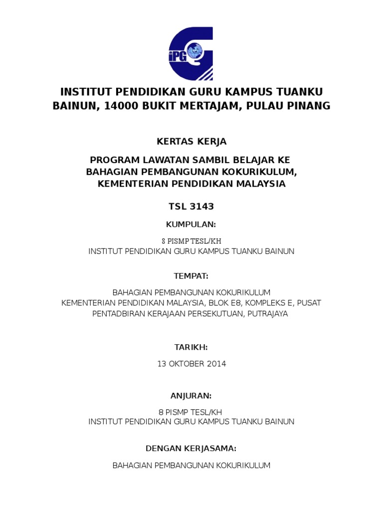 Sejarah awal latihan perguruan di tanah melayu bermula sekitar semua institut pendidikan guru malaysia kampus (ipgk) dikelolakan oleh institut pendidikan guru. Download as docx, pdf, txt or read online from scribd. Ipg kampus tuanku bainun, bukit mertajam mengkuang, kubang semang, 14000 s.perai, pulau pinang. Get available institute nearby you. Institut pendidikan guru (ipg) (kampus.