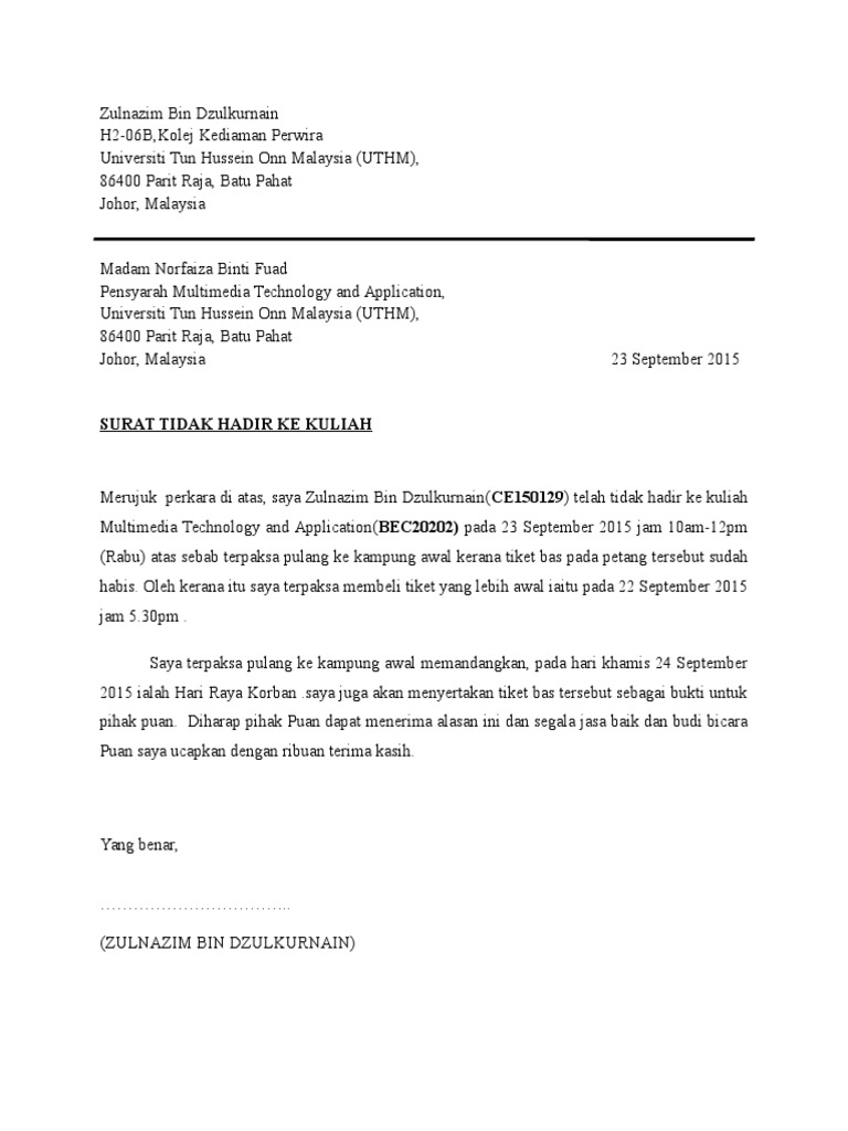 Contoh surat tidak masuk kuliah karena acara keluarga. Kursus kerjaya studio 4 years ago. Koleksi surat rasmi pelajar tidak dapat menghadiri diri ke sekolah atas pelbagai alasan munasabah. Download surat ketidakhadiran ke kuliah. Surat juga sebaiknya ditulis dengan ringkas tetapi memberikan informasi yang tepat dan maklumat yang perlu sahaja.
